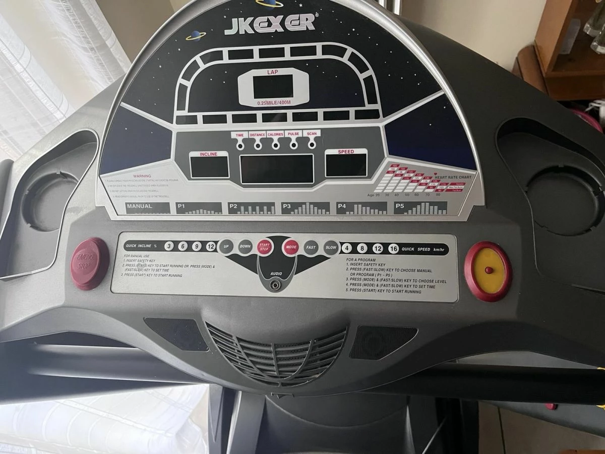 ΔΙΆΔΡΟΜΟΣ JKEXER σχεδόν αχρησιμοποίητος Ισχύς ηλεκτρικού μοτέρ 2. 5 hp Dc συνεχές/ 4 , 5 hp peak Ελάχιστη / μέγιστη ταχύτητα:0 , 8 -16 km/h Ηλεκτρική ενέργεια:230 V/50 Hz Ηλεκτρική προσαρμογή κλίσης 0 – 10 % Ροδάκια μετακίνησης Αναδίπλωση με soft lowering system. Αντικραδασμικό σύστημα Διαστάσεις επιφάνειας τρεξίματος (ΜxΠ σε cm):132 x43 cm Διαστάσεις όταν στηθεί (ΜxΠxΥ):170 x74 x137 cm Διαστάσεις όταν διπλωθεί (ΜxΠxΥ):69 x74 x160 cm Μέγιστο βάρος ασκούμενου:125 kg Computer Προπόνησης 6 Επιλεγόμενα προγράμματα προπόνησης Μέτρηση χρόνου Μέτρηση ταχύτητας Διανυθείσα απόσταση Συνολικά χιλιόμετρα Μέτρηση καρδιακών σφυγμών.