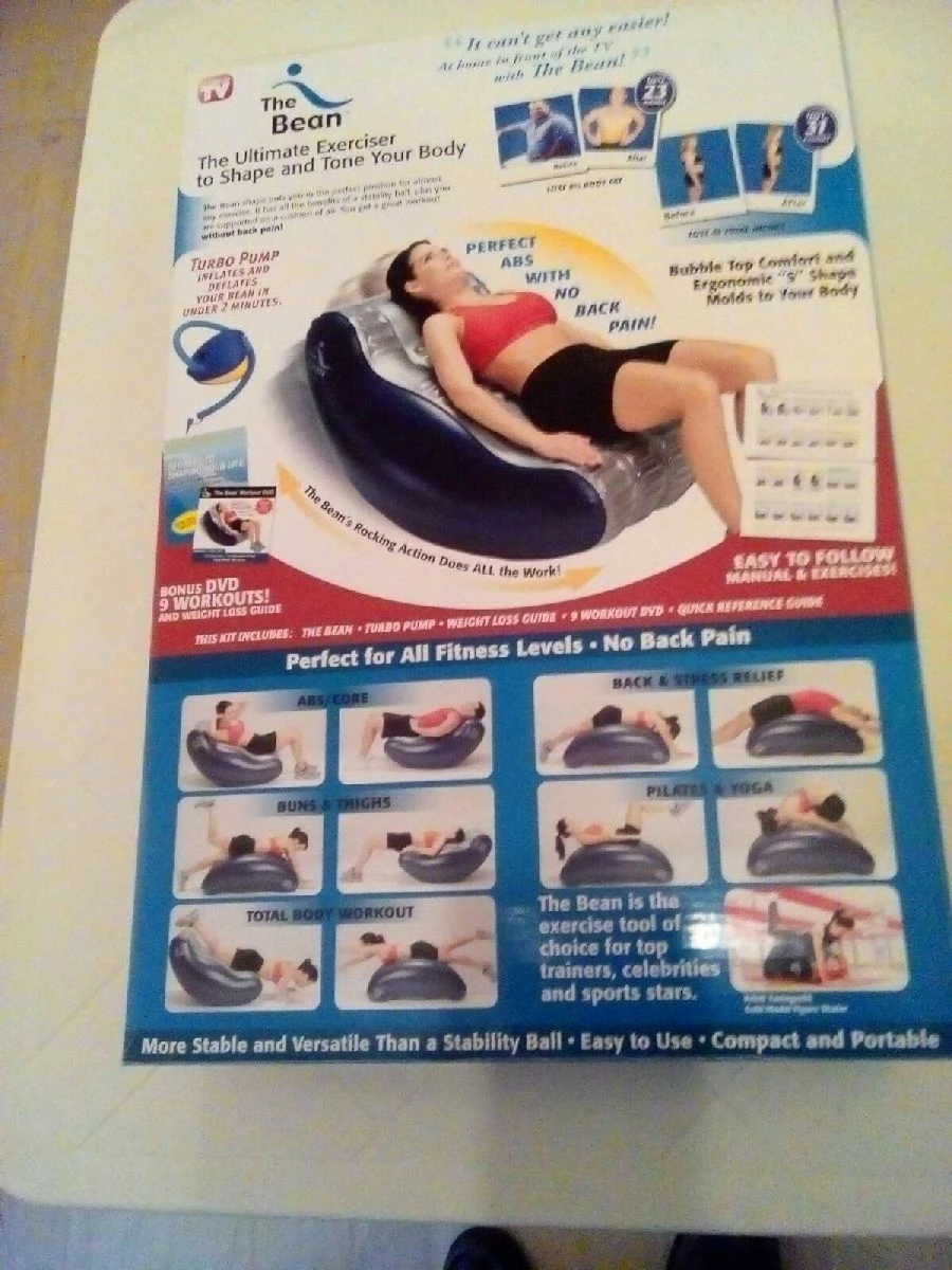 Βοήθημα γυμναστικής The Bean που φουσκώνει με το στόμα ή με τρόμπα μαζί με κατάλογο ασκήσεων για κοιλιακούς, ραχιαίους, πλάτη.