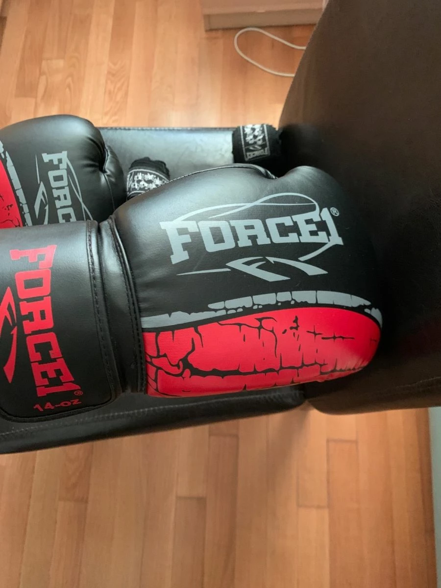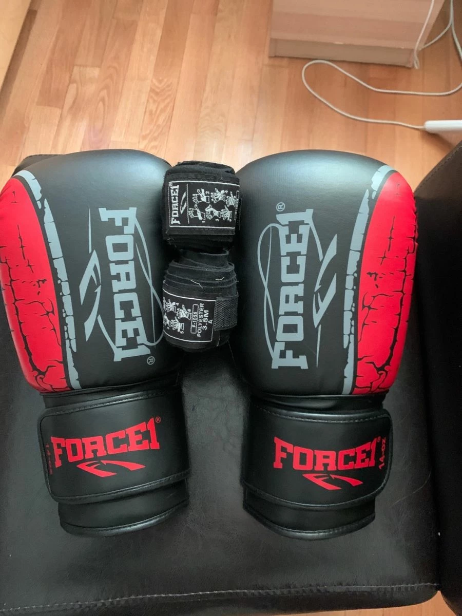 Γάντια Μποξ Force1 κόκκινο με μαύρο χρώμα 14 μέγεθος + γάζες για δέσιμο χεριών 3,5 μέτρα