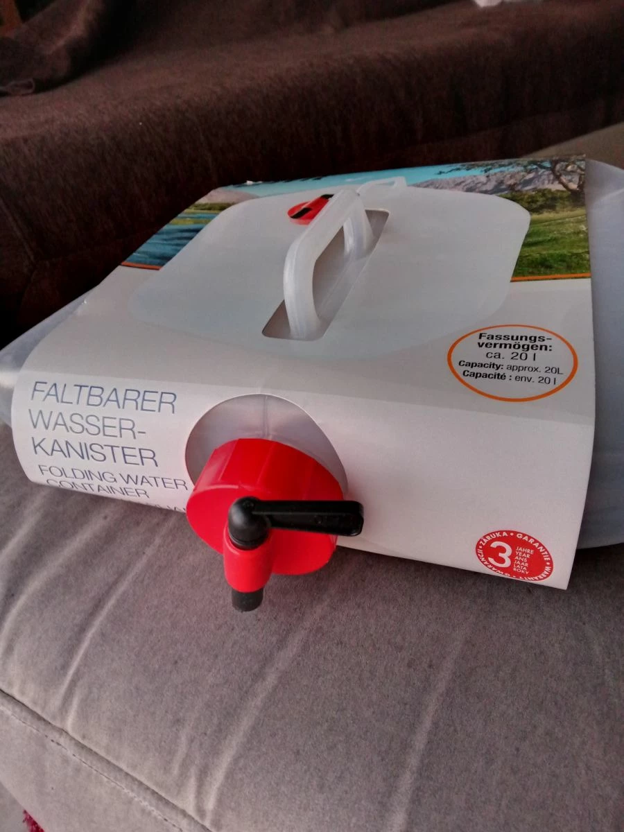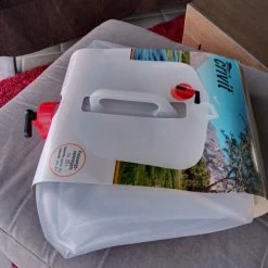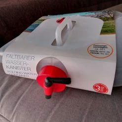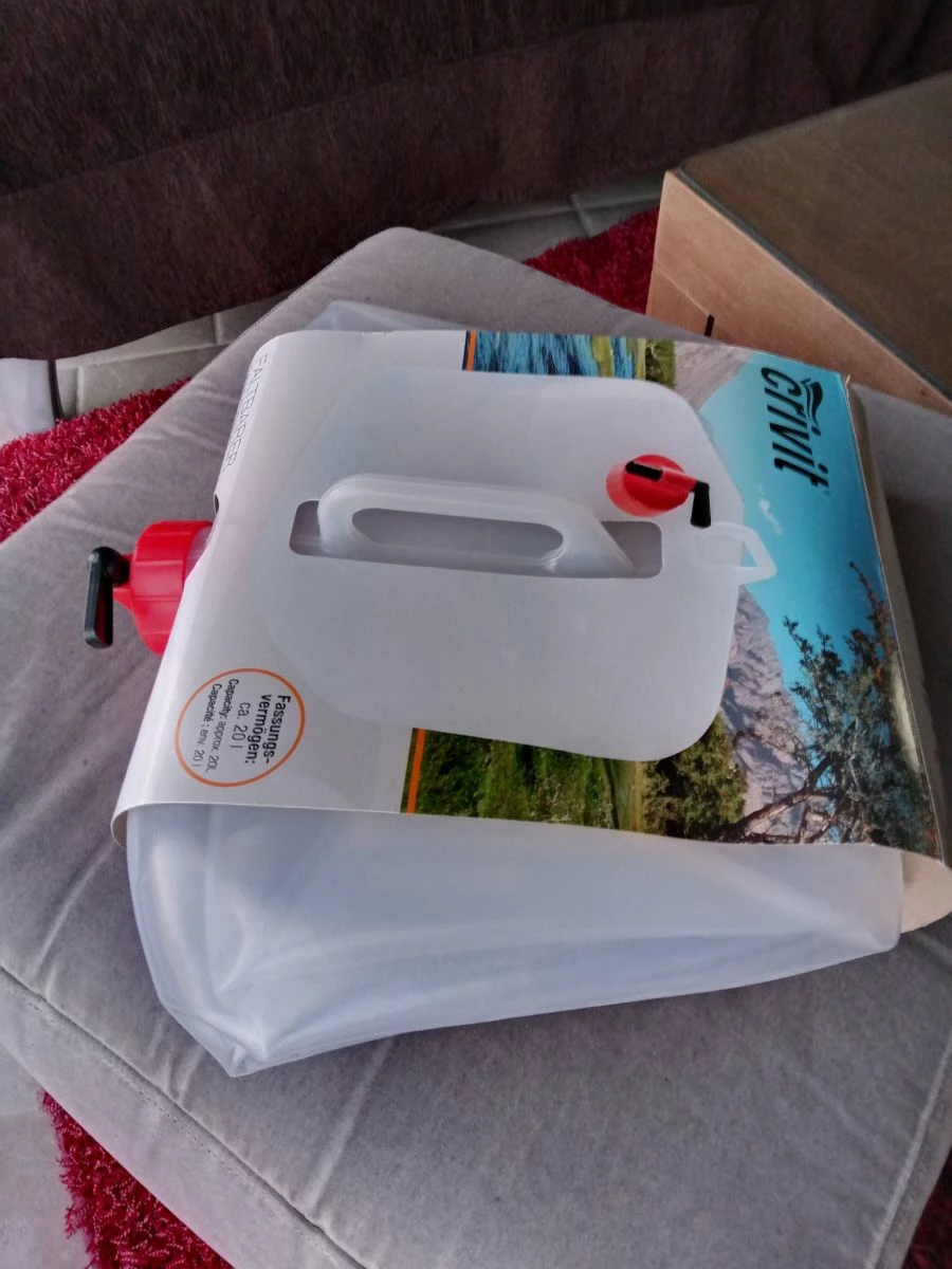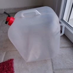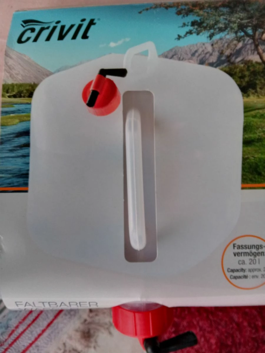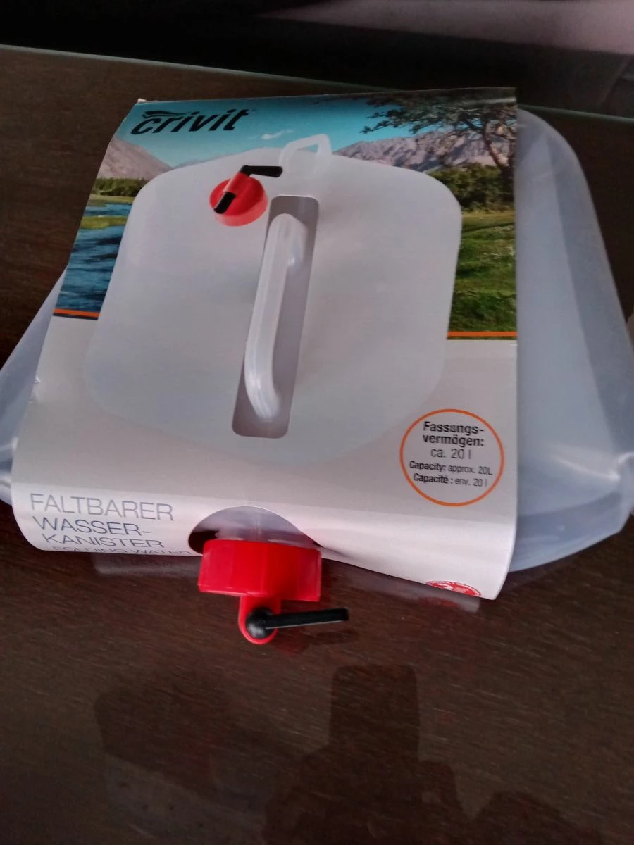 Πτυσσόμενο μπιτόνι πόσιμου νερού Crivit. Χωρητικότητα 20 λίτρα περίπου, διαστάσεις περίπου 27,5x32x34,5 εκατοστά (ΠxΥxΒ). Διαθέτει πώμα με δοσομετρική βρύση και δύο χειρολαβές για ευκολία στη χρήση. Καινούριο. Περιλαμβάνονται οδηγίες χρήσης.