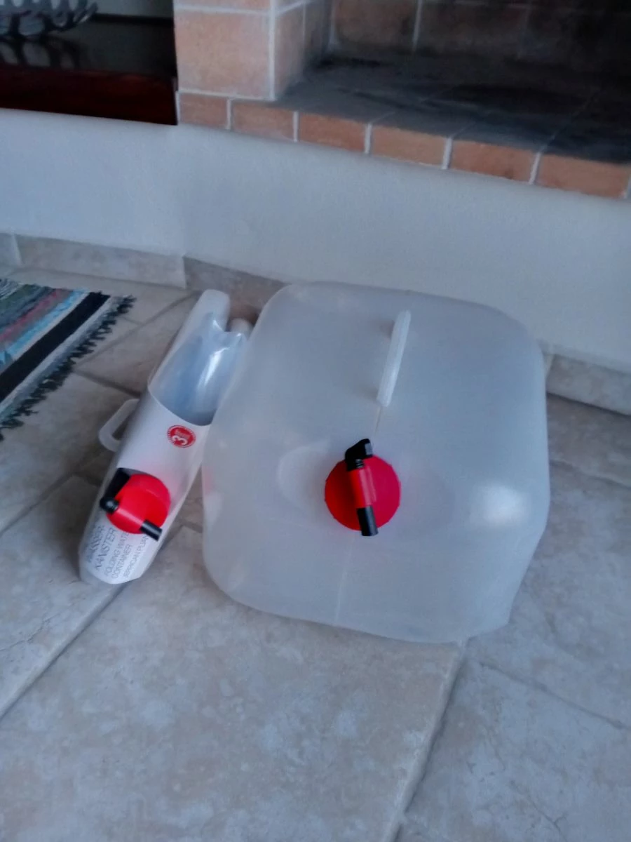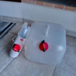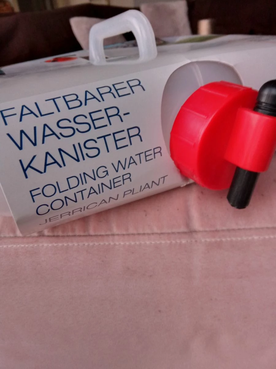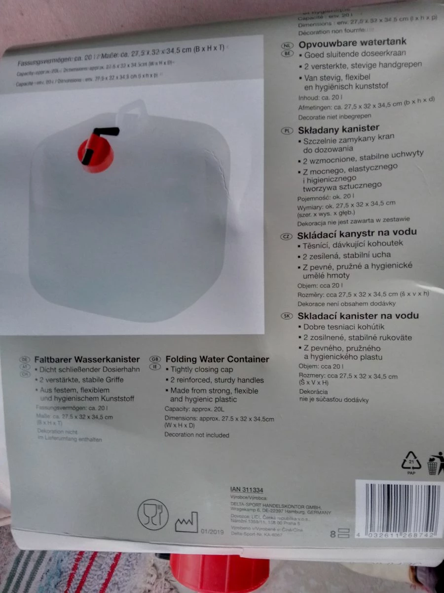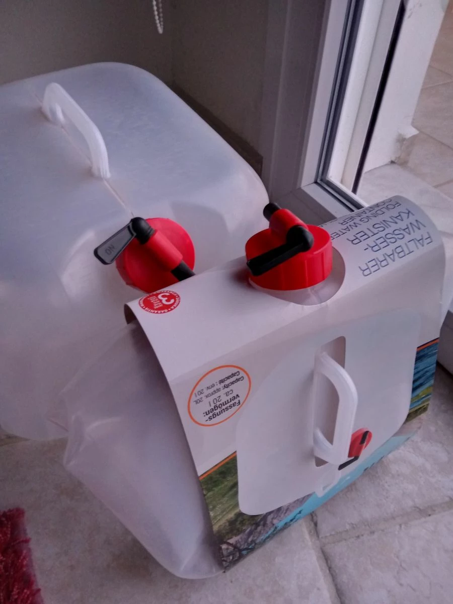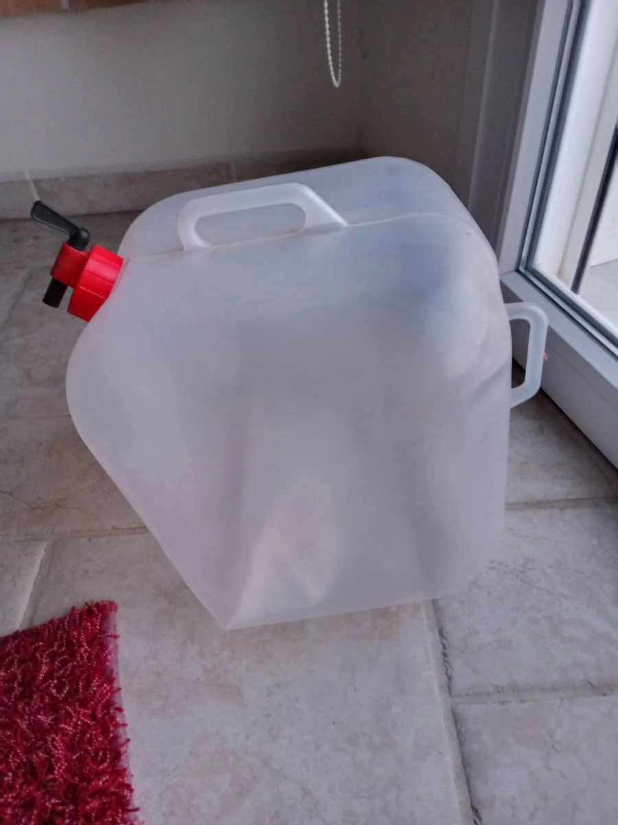 Πτυσσόμενο μπιτόνι πόσιμου νερού Crivit. Χωρητικότητα 20 λίτρα περίπου, διαστάσεις περίπου 27,5x32x34,5 εκατοστά (ΠxΥxΒ). Διαθέτει πώμα με δοσομετρική βρύση και δύο χειρολαβές για ευκολία στη χρήση. Καινούριο. Περιλαμβάνονται οδηγίες χρήσης.